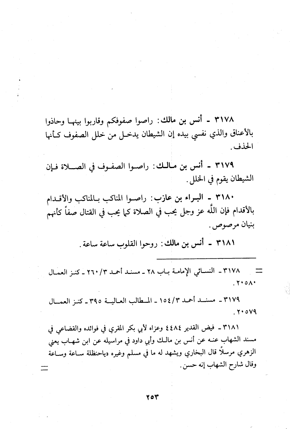 راصوا صفوفكم وقاربوا بَينهَا وحاذوا بالأعناق وَالَّذِي نَفسِي بِيَدِهِ إِن الشَّيْطَان يدْخل من خلل الصُّفُوف كَأَنَّهَا الْحَذف