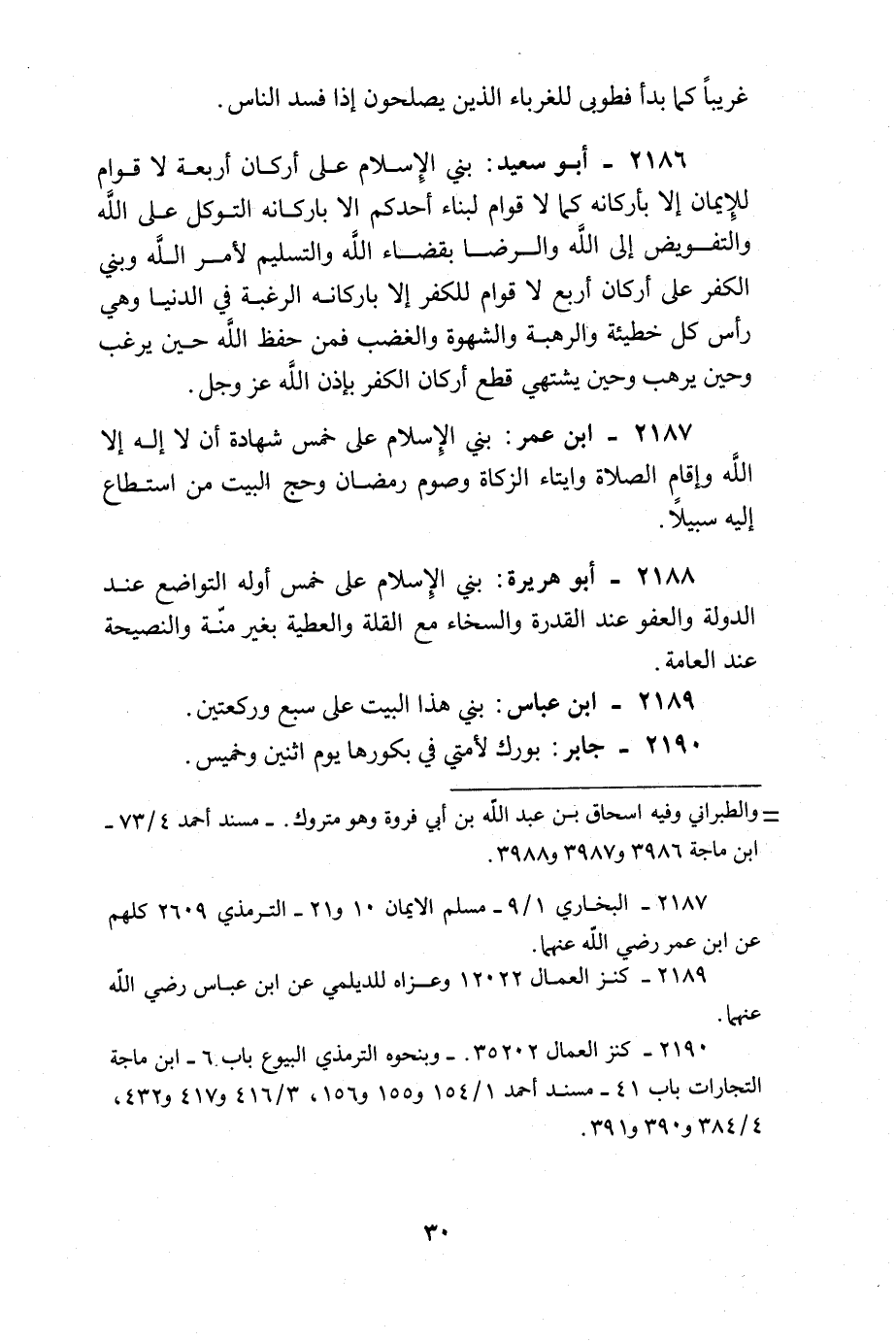 بني الْإِسْلَام على أَرْكَان أَرْبَعَة لَا قوام للْإيمَان إِلَّا بأركانه كَمَا لَا قوام لبِنَاء أحدكُم الا باركانه التَّوَكُّل على الله والتفويض إِلَى الله وَالرِّضَا بِقَضَاء الله وَالتَّسْلِيم لأمر الله وَبني الْكفْر على أَرْكَان أَربع لَا قوام للكفر إِلَّا باركانه الرَّغْبَة فِي الدُّنْيَا وَهِي رَأس كل حطيئة والرهبة والشهوة وَالْغَضَب فَمن حفظ الله حِين يرغب وَحين يرهب وَحين يَشْتَهِي قطع أَرْكَان الْكفْر بِإِذن الله عز وَجل