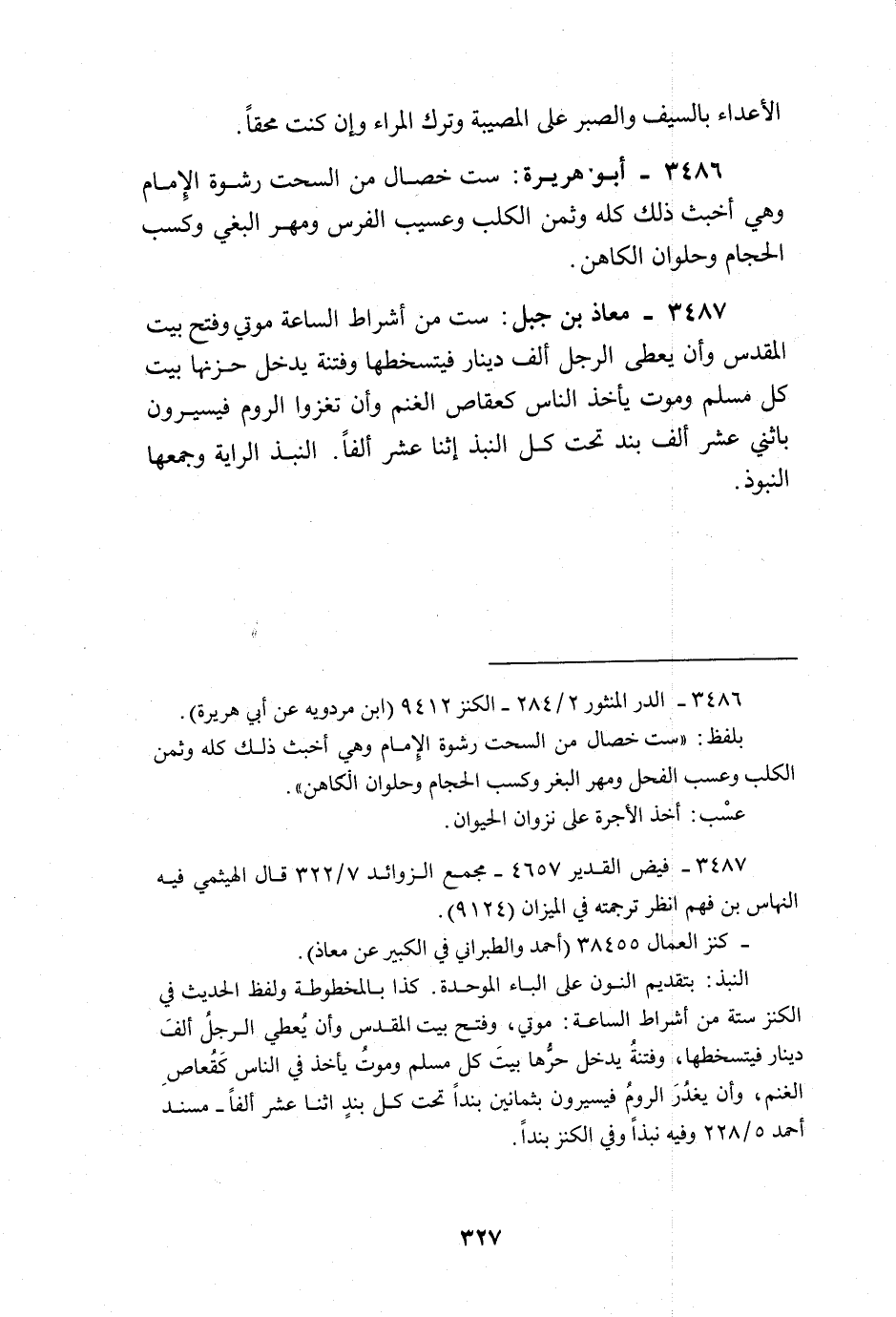 سِتّ من أَشْرَاط السَّاعَة موتِي وَفتح بَيت الْمُقَدّس وَأَن يعْطى الرجل ألف دِينَار فيتسخطها وفتنة يدْخل حزنها بَيت كل مُسلم ومونت يَأْخُذ النَّاس كعقاص الْغنم وَأَن تغزوا الرّوم فيسيرون باثنتي عشر الف بند تَحت كل النبذ إثنا عشر ألفا النبذ الرَّايَة وَجَمعهَا النبوذ
