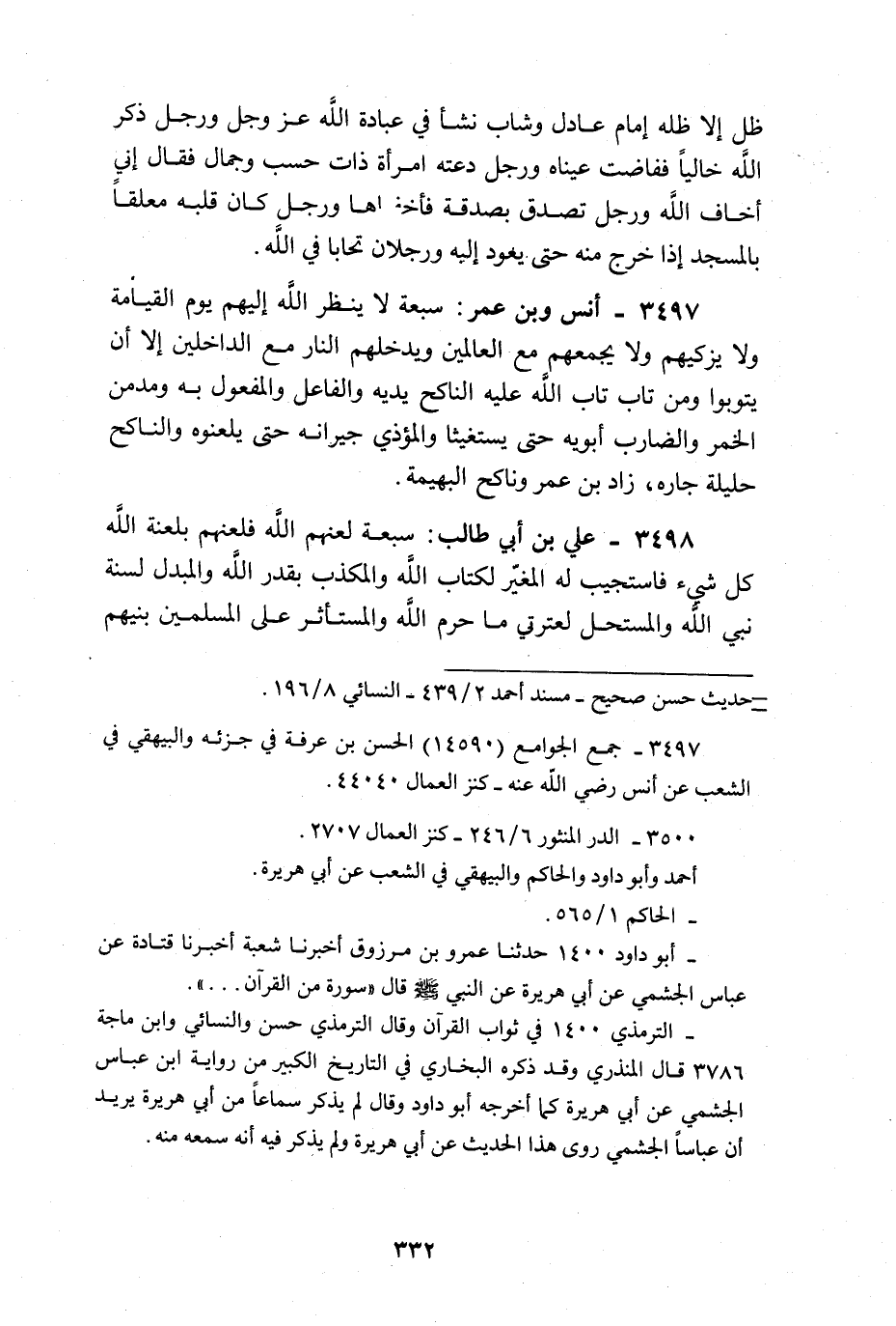ظلّ إِلَّا ظله إِمَام عَادل وشاب نَشأ فِي عبَادَة الله عز وَجل وَرجل ذكر الله خَالِيا فَفَاضَتْ عَيناهُ وَرجل دَعَتْهُ امْرَأَة ذَات حسب وجمال فَقَالَ إِنِّي أَخَاف الله وَرجل تصدق بِصَدقَة فأخفاها وَرجل كَانَ قلبه مُعَلّقا بِالْمَسْجِدِ إِذا خرج مِنْهُ حَتَّى يعود إِلَيْهِ ورجلان تحابا فِي الله