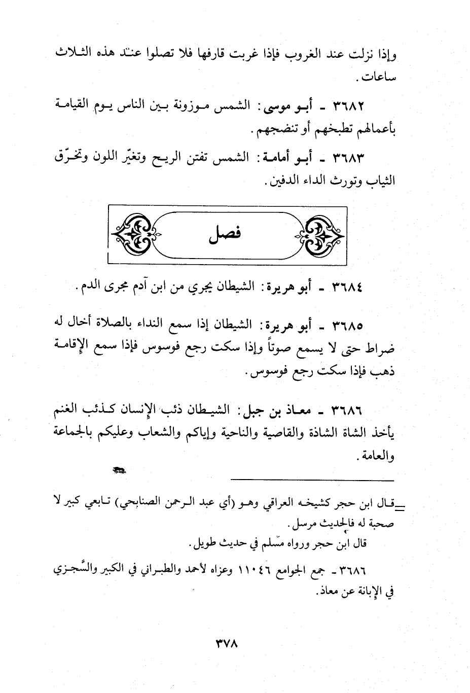 الشَّيْطَان ذِئْب الْإِنْسَان كذئب الْغنم يَأْخُذ الشَّاة الشَّاة والقاصية والناحية وَإِيَّاكُم والشعاب وَعَلَيْكُم بِالْجَمَاعَة والعامة
