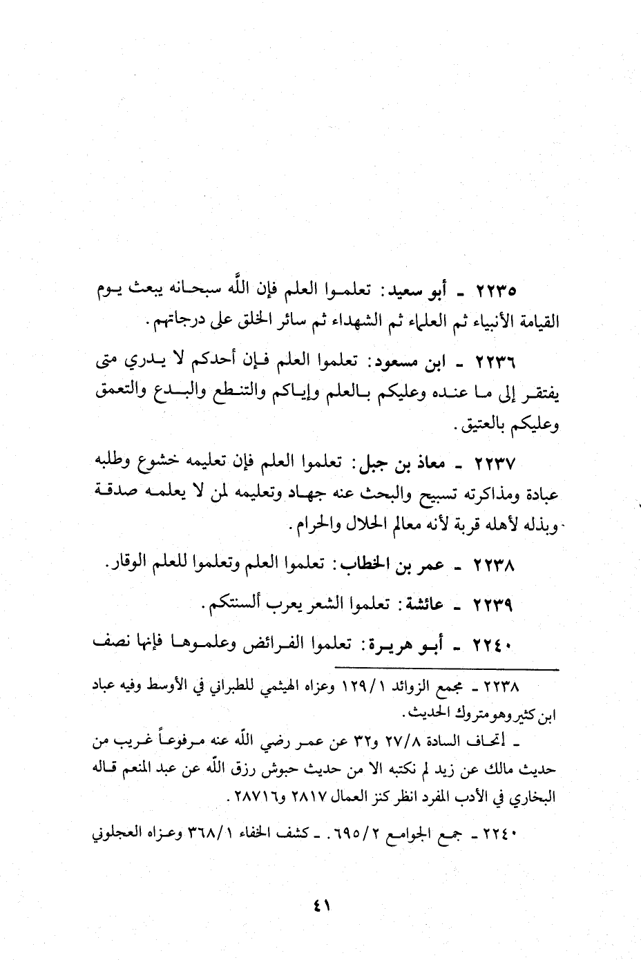 تعلمُوا الْعلم فَإِن تَعْلِيمه خشوع وَطَلَبه عبَادَة ومذاكرته تَسْبِيح والبحث عَنهُ جِهَاد وتعليمه لمن لَا يُعلمهُ صَدَقَة وبذله لأَهله قربَة لِأَنَّهُ معالم الْحَلَال وَالْحرَام