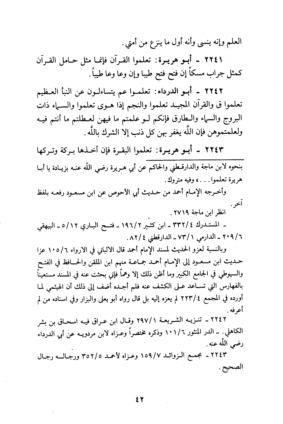 تعلمُوا عَم يتساءلون عَن النبأ الْعَظِيم تعلمُوا وَالْقُرْآن الْمجِيد تعلمُوا والنجم إِذا هوى تعلمُوا وَالسَّمَاء ذَات البروج وَالسَّمَاء والطارق فَإِنَّكُم لَو علمْتُم مَا فِيهِنَّ لعطلتم مَا أَنْتُم فِيهِ ولعلمتموهن فَإِن الله يغْفر بِهن كل ذَنْب إِلَّا الشّرك بِاللَّه