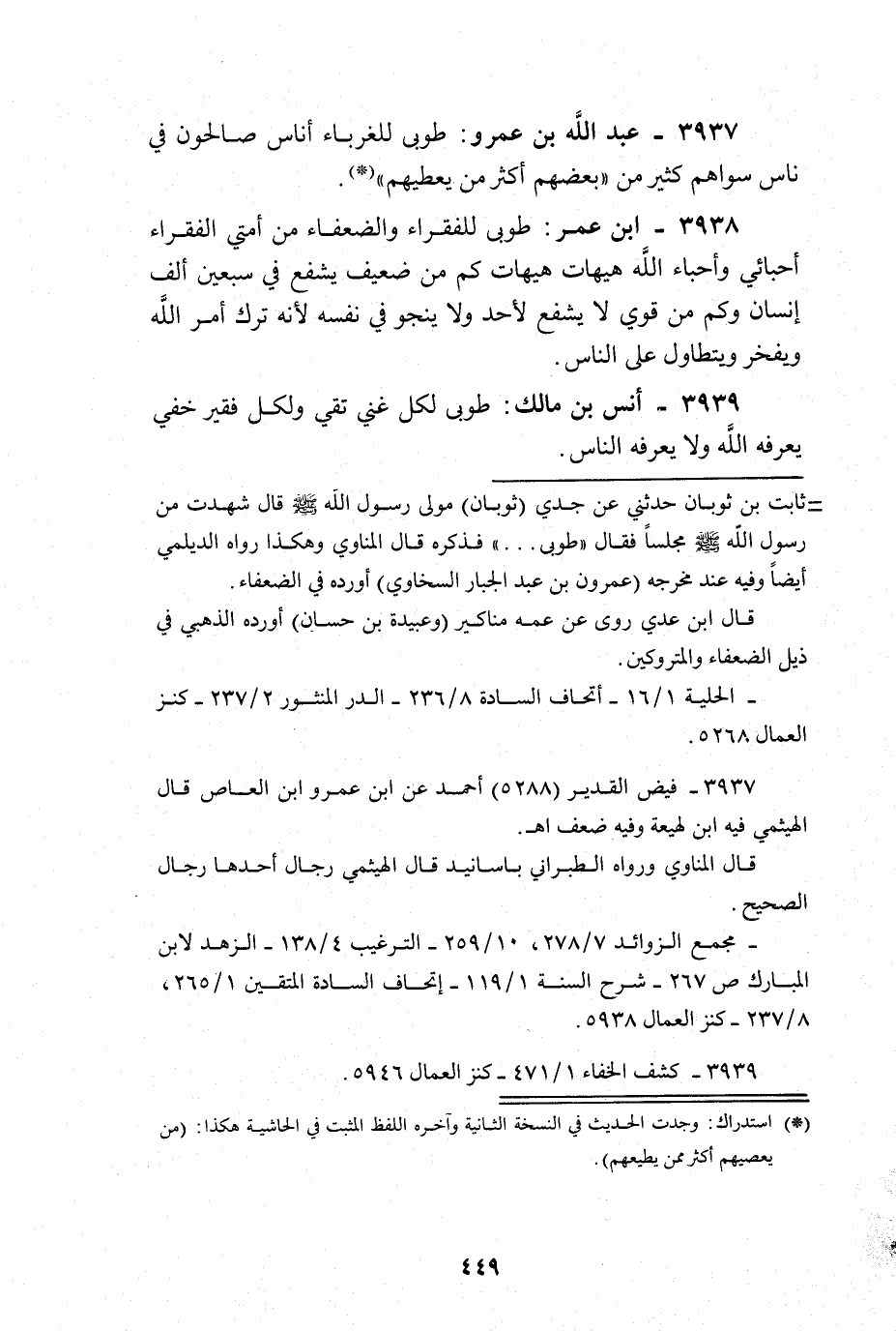 طُوبَى للْفُقَرَاء والضعفاء من أمتِي الْفُقَرَاء أحبائي وأحباء الله هَيْهَات هَيْهَات كم من ضَعِيف يشفع فِي سبعين ألف إِنْسَان وَكم من قوي لَا يشفع لأحد وَلَا ينجو فِي نَفسه لِأَنَّهُ ترك أَمر الله ويفخر ويتطاول على النَّاس