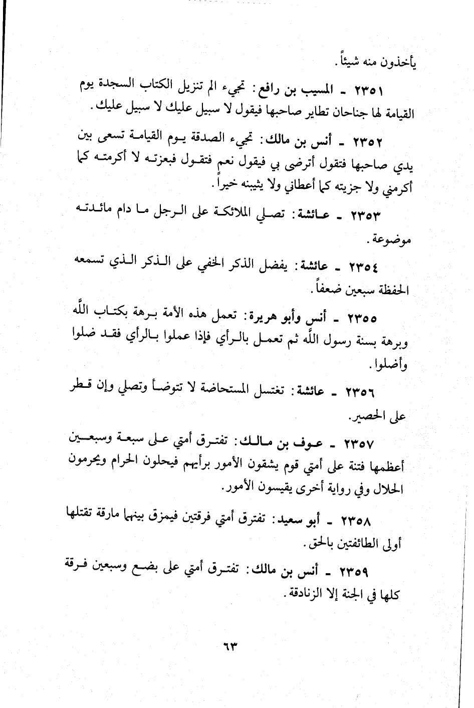 تفترق أمتِي على سَبْعَة وَسبعين أعظمها فتْنَة على أمتِي قوم يشقون الْأُمُور برأيهم فيحلون الْحَرَام ويحرمون الْحَلَال وَفِي رِوَايَة أُخْرَى يقيسون الْأُمُور