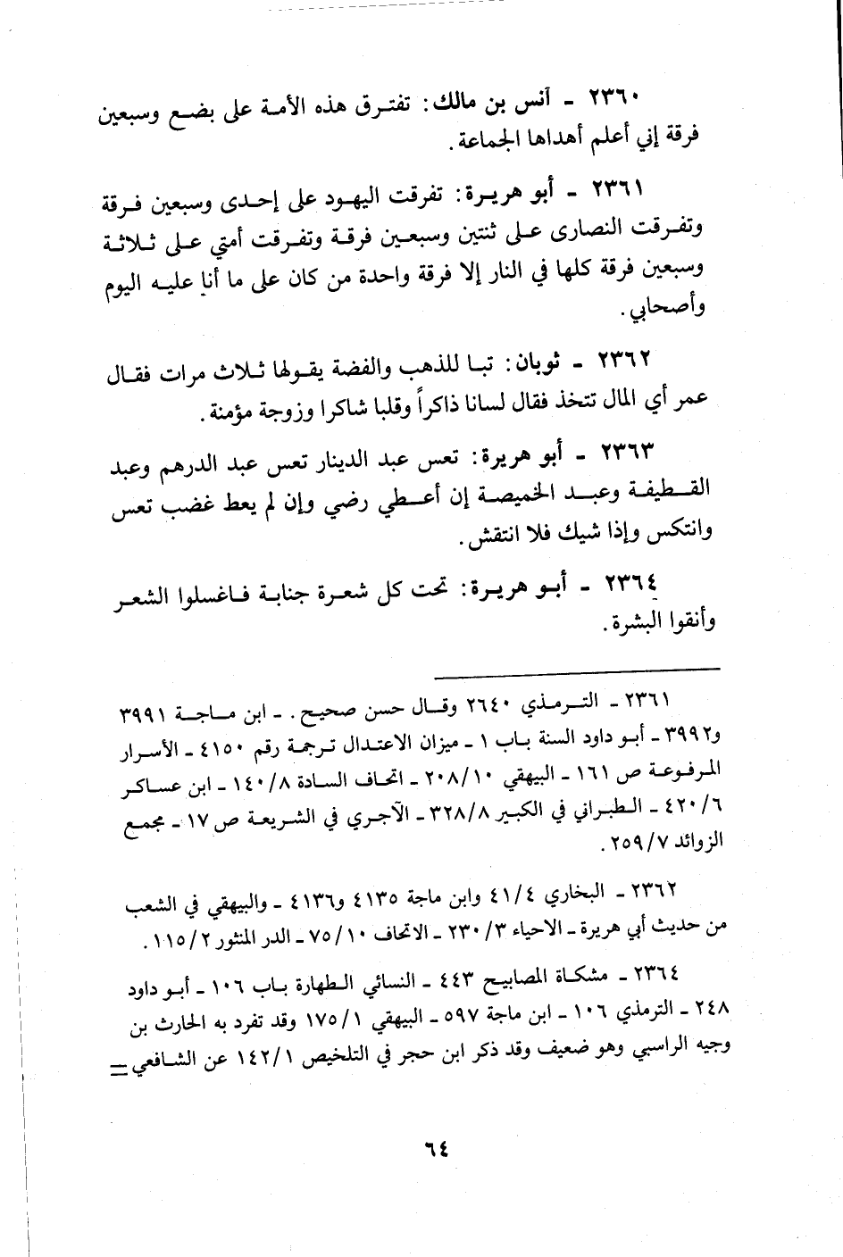 تَفَرَّقت الْيَهُود على إِحْدَى وَسبعين فرقة وَتَفَرَّقَتْ النَّصَارَى على ثِنْتَيْنِ وَسبعين فرقة وَتَفَرَّقَتْ أمتِي عَليّ ثَلَاثَة وَسبعين فرقة كلهَا فِي النَّار إِلَّا فرقة وَاحِدَة من كَانَ على مَا أَنا عَلَيْهِ الْيَوْم وأصحابي