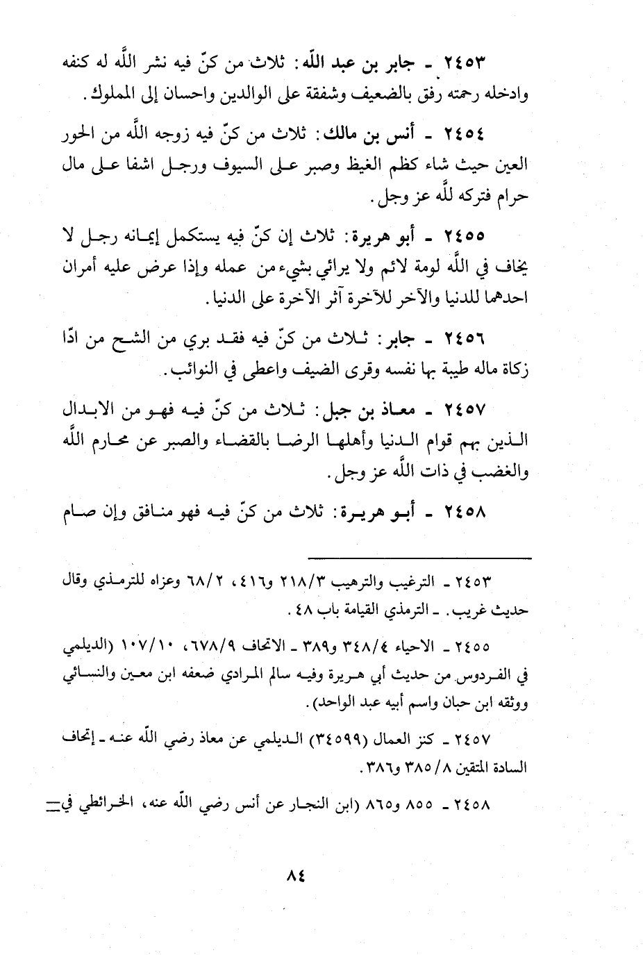 ثَلَاث إِن كن فِيهِ يستكمل إيمَانه رجل لَا يخَاف فِي الله لومة لائم وَلَا يرائي بِشَيْء من عمله وَإِذا عرض عَلَيْهِ أَمْرَانِ احدهما للدنيا والاخر للآخرة آثر الْآخِرَة على الدُّنْيَا