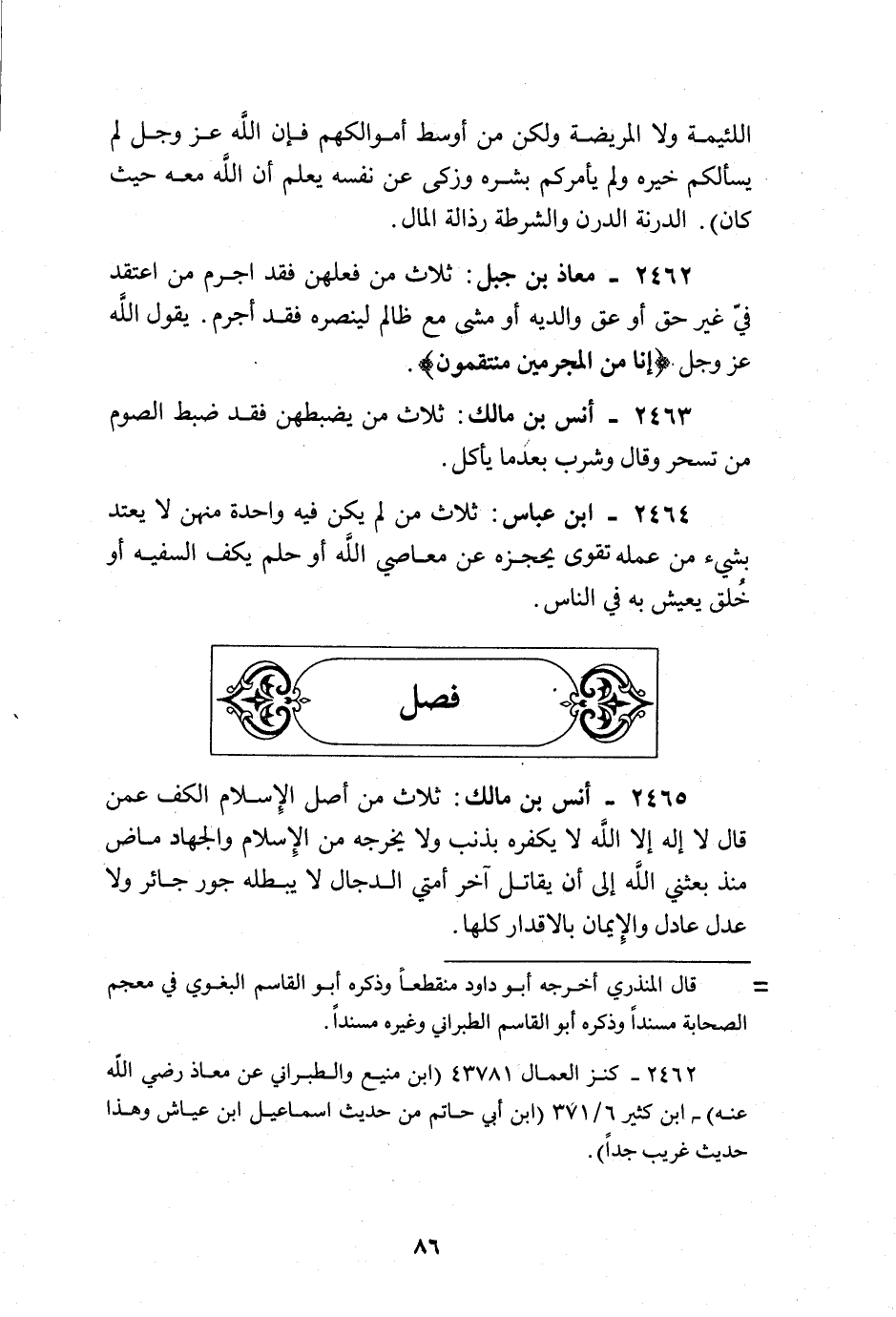 ثَلَاث من أصل الْإِسْلَام الْكَفّ عَمَّن قَالَ لَا إِلَه إِلَّا الله لَا يكفره بذنب وَلَا يُخرجهُ من الْإِسْلَام وَالْجهَاد مَاض مُنْذُ بَعَثَنِي الله إِلَى أَن يُقَاتل آخر أمتِي الدَّجَّال لَا يُبطلهُ جور جَائِر وَلَا عدل عَادل وَالْإِيمَان بالاقدار كلهَا