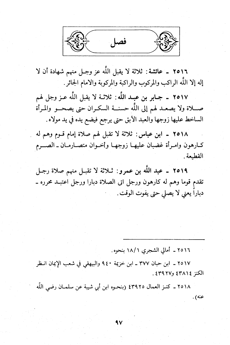 ثَلَاثَة لَا تقبل لَهُم صَلَاة إِمَام قوم وهم لَهُ كَارِهُون وَامْرَأَة غَضْبَان عَلَيْهَا زَوجهَا وَأَخَوَانِ متصارمان الصرم القطيعة