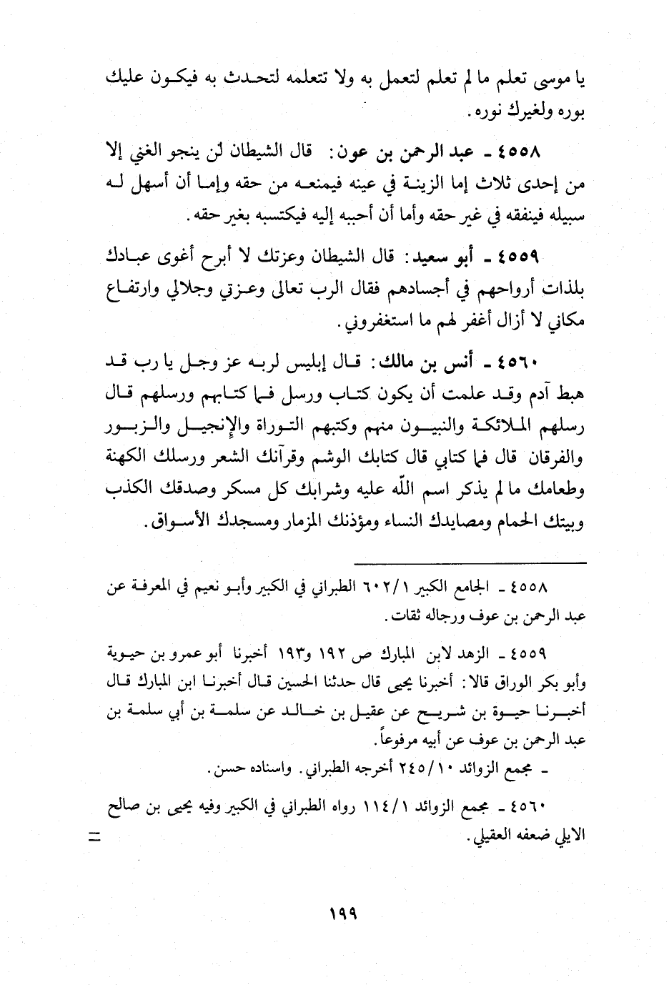 قَالَ الشَّيْطَان وَعزَّتك لَا أَبْرَح أغوى عِبَادك بلذات أَرْوَاحهم فِي أَجْسَادهم فَقَالَ الرب تَعَالَى وَعِزَّتِي وَجَلَالِي وارتفاع مَكَاني لَا أَزَال أَغفر لَهُم مَا استغفروني