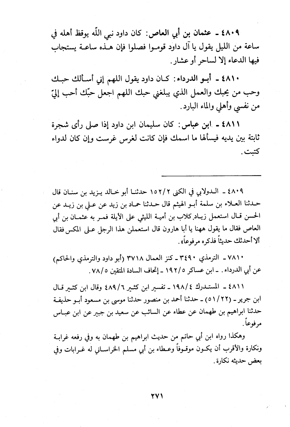 كَانَ دَاوُد نَبِي الله يوقظ أَهله فِي سَاعَة من اللَّيْل يَقُول يَا آل دَاوُد قومُوا فصلوا فَإِن هَذِه سَاعَة يُسْتَجَاب فِيهَا الدُّعَاء إِلَّا لساحر أَو عشار