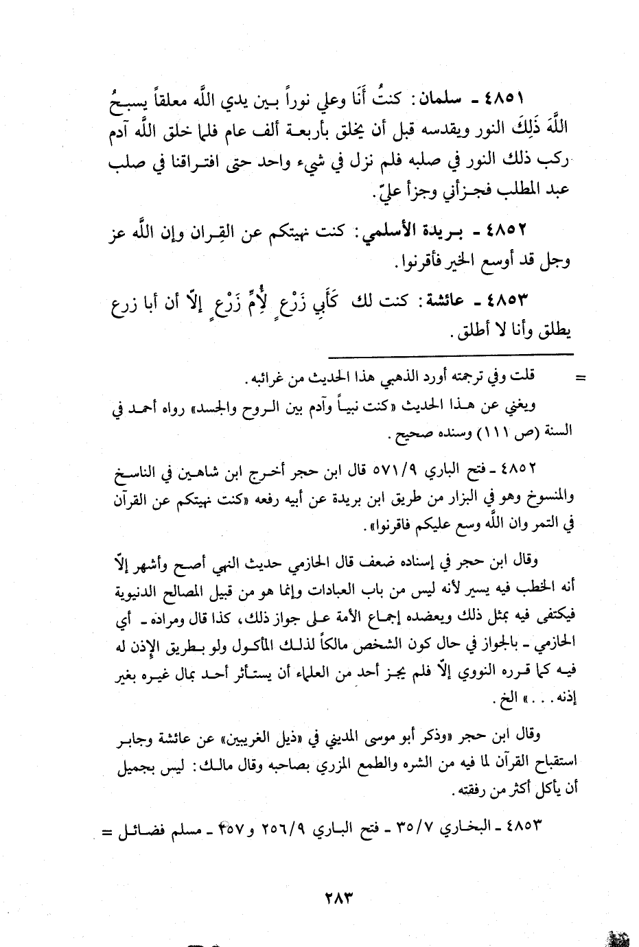 كنت أَنا وَعلي نورا بَين يَدي الله مُعَلّقا يسبح الله ذَلِك النُّور ويقدسه قبل أَن يخلق بأَرْبعَة ألف عَام فَلَمَّا خلق الله آدم ركب ذَلِك النُّور فِي صلبه فَلم نزل فِي شَيْء وَاحِد حَتَّى افتراقنا فِي صلب عبد الْمطلب فجزأني وجزأ عَليّ