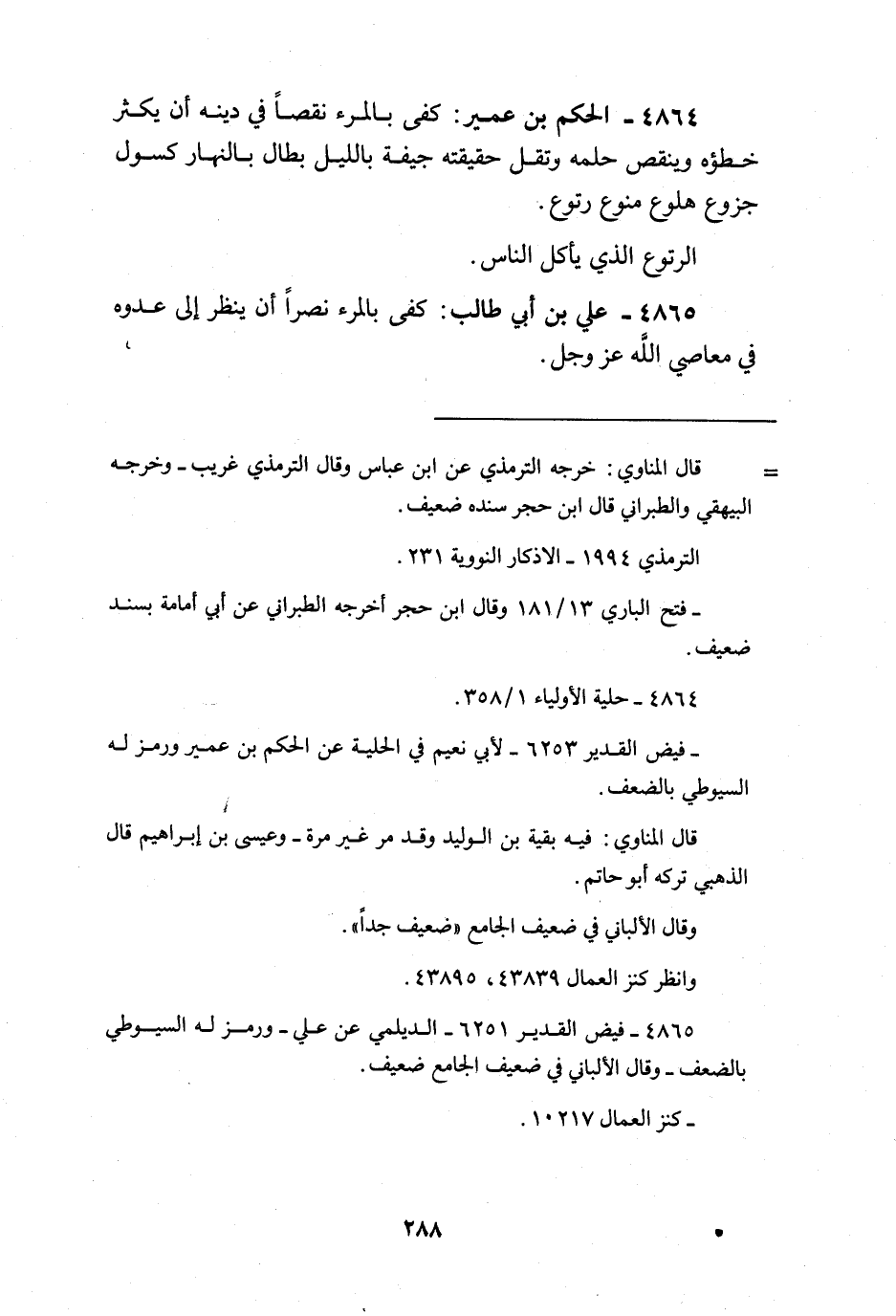 كفى بِالْمَرْءِ نقصا فِي دينه أَن يكثر خَطؤُهُ وَينْقص حلمه وتقل حَقِيقَته جيفة بِاللَّيْلِ بطال بِالنَّهَارِ كسول جزوع هلوع منوع رتوع