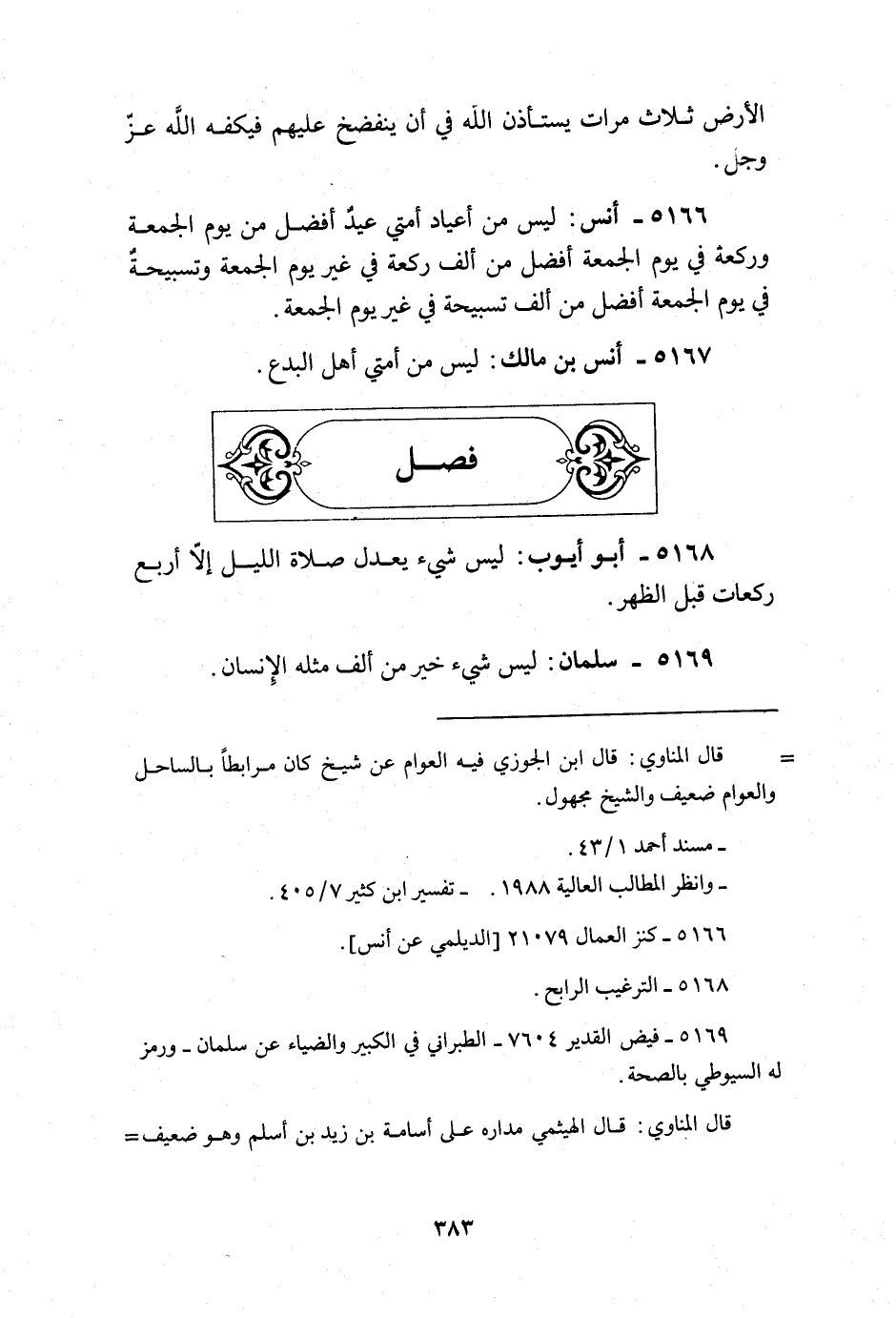 لَيْسَ من أعياد أمتِي عيد أفضل من يَوْم الْجُمُعَة وركعة فِي يَوْم الْجُمُعَة أفضل من ألف رَكْعَة فِي غير يَوْم الْجُمُعَة وتسبيحة فِي يَوْم الْجُمُعَة أفضل من ألف تَسْبِيحَة فِي غير يَوْم الْجُمُعَة