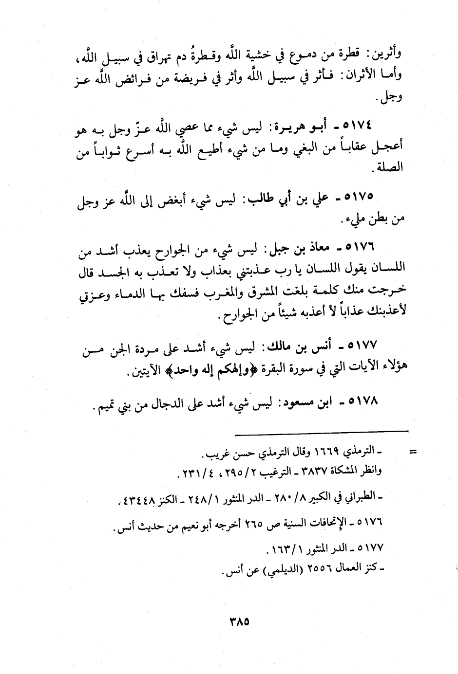 وأثرين قَطْرَة من دموع فِي خشيَة الله وقطرة دم تهراق فِي سَبِيل الله وَأما الأثران فأثر فِي سَبِيل الله وَأثر فِي فَرِيضَة من فَرَائض الله عز وَجل