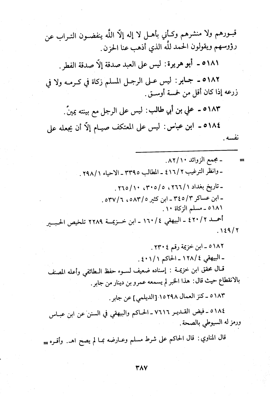 5182 - جَابر لَيْسَ على الرجل الْمُسلم زَكَاة فِي كرمه وَلَا فِي زرعه إِذا كَانَ أقل من خَمْسَة أوسق