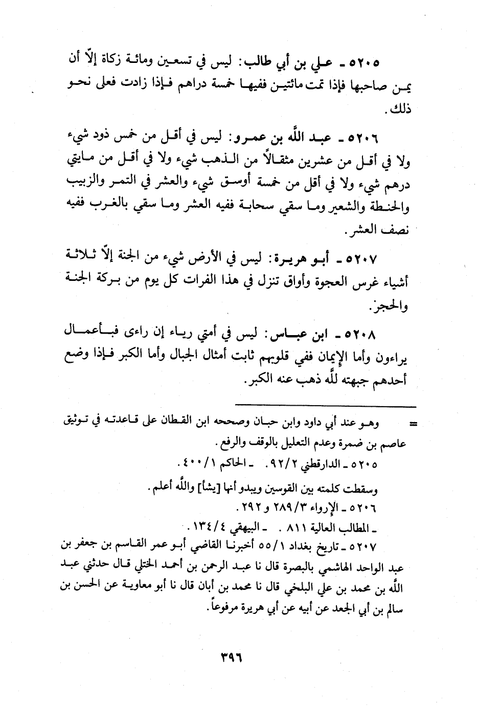 لَيْسَ فِي أقل من خمس ذود شَيْء وَلَا فِي أقل من عشْرين مِثْقَالا من الذَّهَب شَيْء وَلَا فِي أقل من مايتي دِرْهَم شَيْء وَلَا فِي أقل من خَمْسَة أوسق شَيْء وَالْعشر فِي التَّمْر وَالزَّبِيب وَالْحِنْطَة وَالشعِير وَمَا سقِِي سَحَابَة فَفِيهِ الْعشْر وَمَا سقِِي بالغرب فَفِيهِ نصف الْعشْر