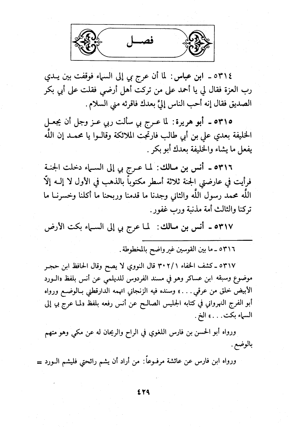 لما عرج بِي إِلَى السَّمَاء دخلت الْجنَّة فَرَأَيْت فِي عارضتي الْجنَّة ثَلَاثَة أسطر مَكْتُوبًا بِالذَّهَب فِي الأول لَا إِلَه إِلَّا الله مُحَمَّد رَسُول الله وَالثَّانِي وجدنَا مَا قدمنَا وربحنا مَا أكلنَا وَخَسِرْنَا مَا تركنَا وَالثَّالِث أمة مذنبة وَرب غَفُور