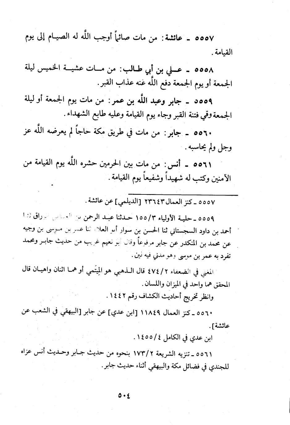 من مَاتَ يَوْم الْجُمُعَة أَو لَيْلَة الْجُمُعَة وقِي فتْنَة الْقَبْر وَجَاء يَوْم الْقِيَامَة وَعَلِيهِ طَابع الشُّهَدَاء