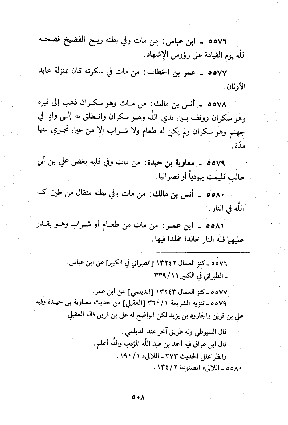 من مَاتَ وَهُوَ سَكرَان ذهب إِلَى قَبره وَهُوَ سَكرَان ووقف بَين يَدي الله وَهُوَ سَكرَان وَانْطَلق بِهِ إِلَى وَاد فِي جَهَنَّم وَهُوَ سَكرَان وَلم يكن لَهُ طَعَام وَلَا شراب إِلَّا من عين تجْرِي مِنْهَا مُدَّة