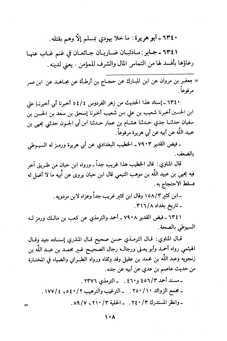 مَا ذئبان ضاريان جائعان فِي غنم غَابَ عَنْهَا رعاؤها بأفسد لَهَا من التمَاس المَال والشرف لِلْمُؤمنِ يَعْنِي لدينِهِ