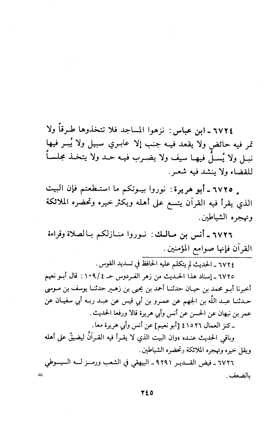 نوروا بُيُوتكُمْ مَا اسْتَطَعْتُم فَإِن الْبَيْت الَّذِي يقْرَأ فِيهِ الْقُرْآن يَتَّسِع على أَهله وَيكثر خَيره وتحضره الْمَلَائِكَة وتهجره الشَّيَاطِين