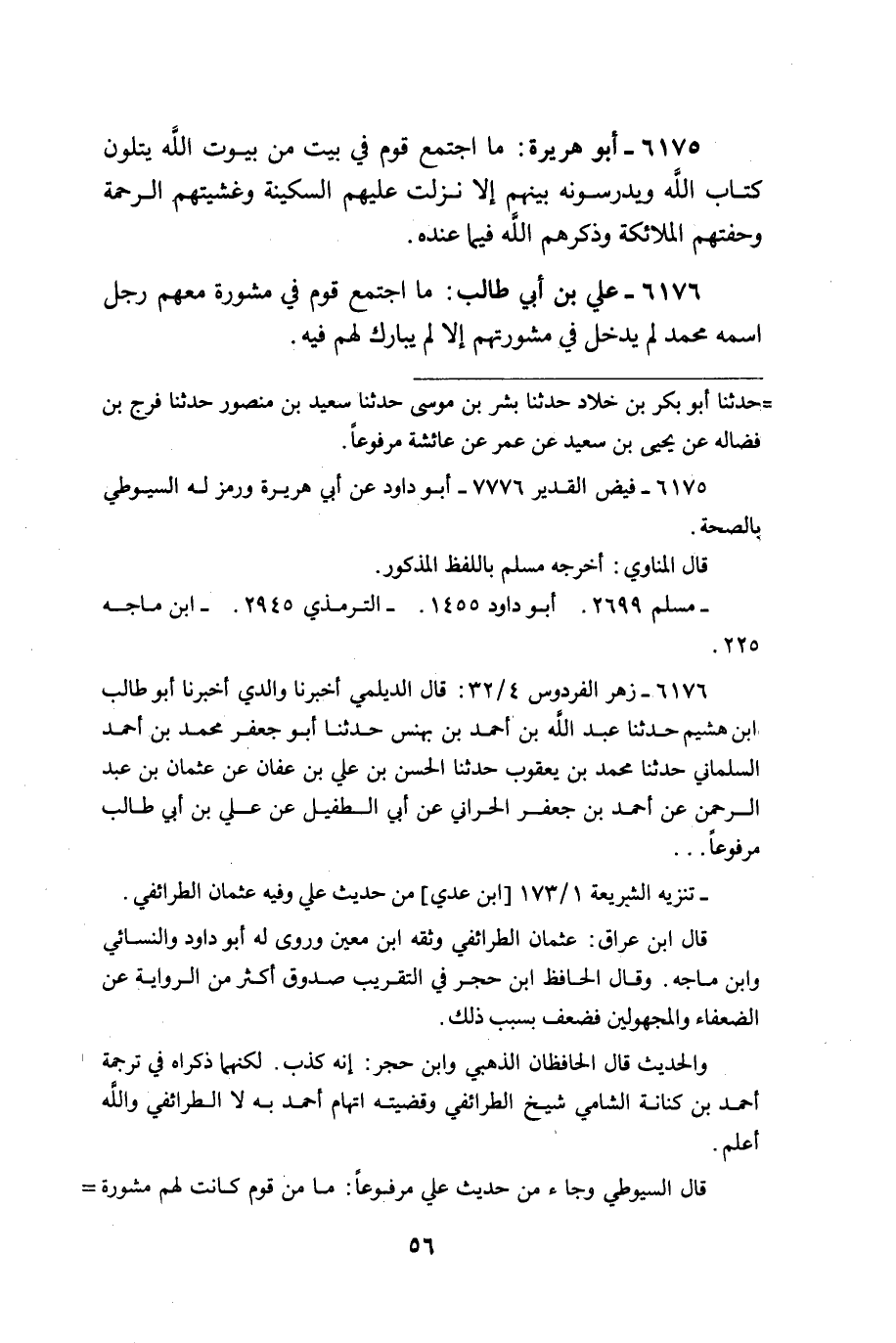 مَا اجْتمع قوم فِي بَيت من بيُوت الله يَتلون كتاب الله ويدرسونه بَينهم إِلَّا نزلت عَلَيْهِم السكينَة وَغَشِيَتْهُمْ الرَّحْمَة وَحَفَّتْهُمْ الْمَلَائِكَة وَذكرهمْ الله فِيمَا عِنْده