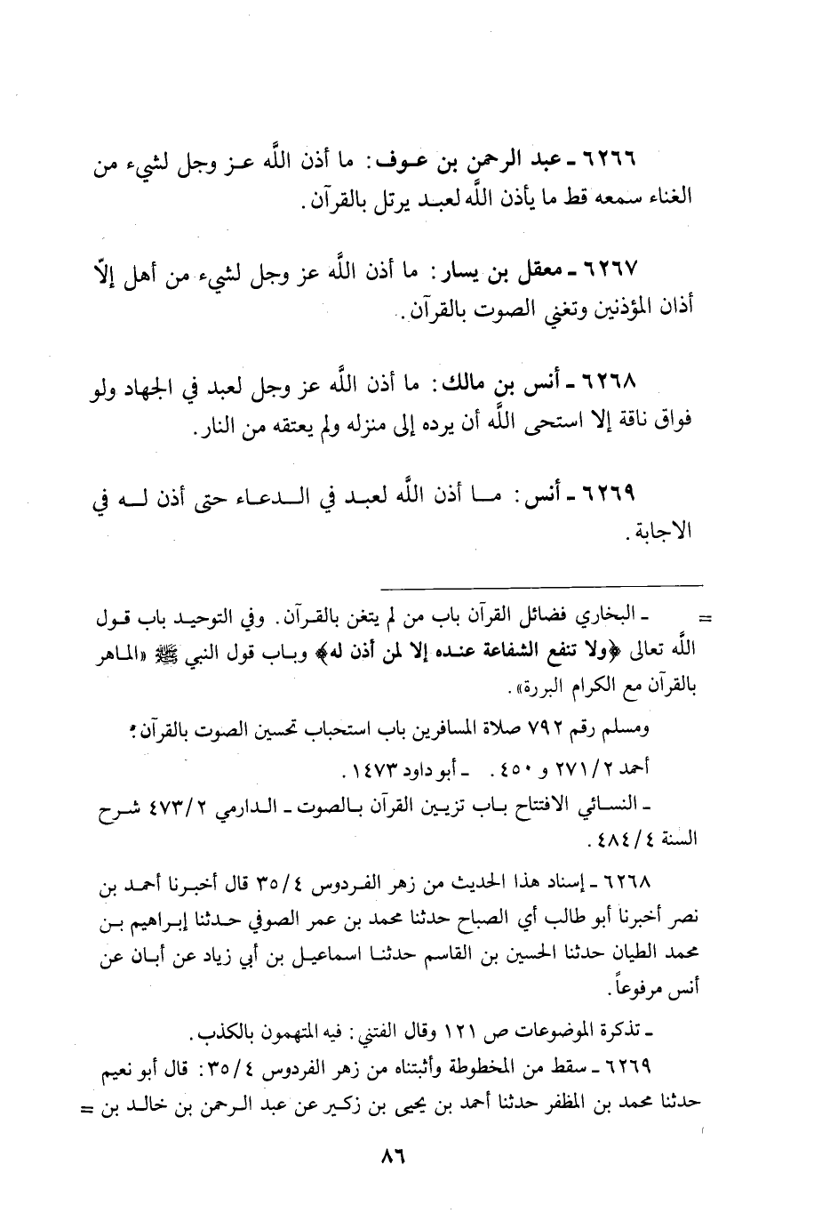 مَا أذن الله عز وَجل لشَيْء من الْغناء سَمعه قطّ مَا يَأْذَن الله لعبد يرتل بِالْقُرْآنِ
