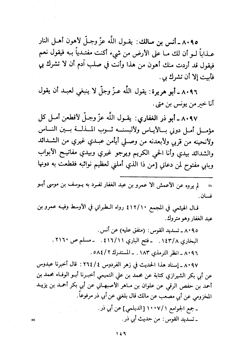 يَقُول الله عز وَجل لأهون أهل النَّار عذَابا لَو أَن لَك مَا على الأَرْض من شَيْء أَكنت مفتديا بِهِ فَيَقُول نعم فَيَقُول قد أردْت مِنْك أَهْون من هَذَا وَأَنت فِي صلب آدم أَن لَا تشرك بِي فأبيت إِلَّا أَن تشرك بِي