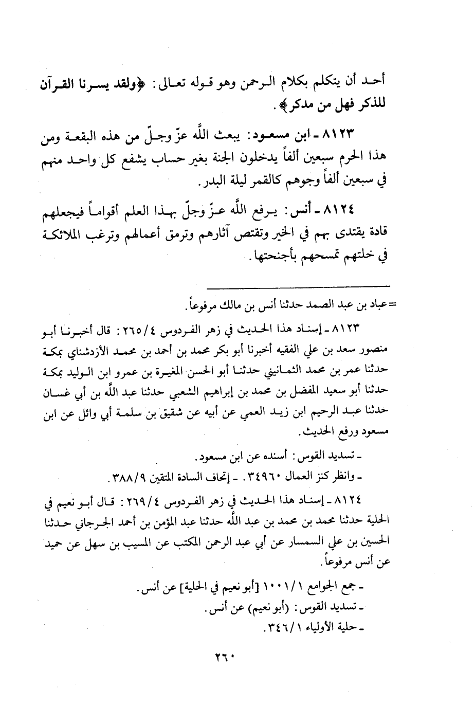 يرفع الله عز وَجل بِهَذَا الْعلم أَقْوَامًا فيجعلهم قادة يقْتَدى بهم فِي الْخَيْر وتقتص آثَارهم وترمق أَعْمَالهم وترغب الْمَلَائِكَة فِي خلتهم تمسحهم بأجنحتها
