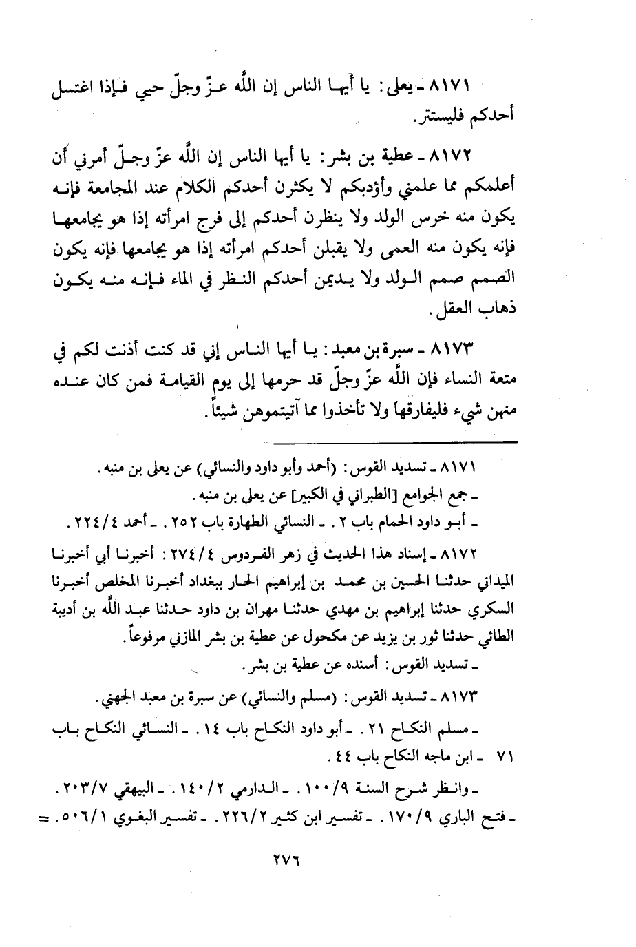 يَا أَيهَا النَّاس إِنِّي قد كنت أَذِنت لكم فِي مُتْعَة النِّسَاء فَإِنَّهُ الله عز وَجل قد حرمهَا إِلَى يَوْم الْقِيَامَة فَمن كَانَ عِنْده مِنْهُنَّ شَيْء فليفارقها وَلَا تَأْخُذُوا مِمَّا آتَيْتُمُوهُنَّ شَيْئا