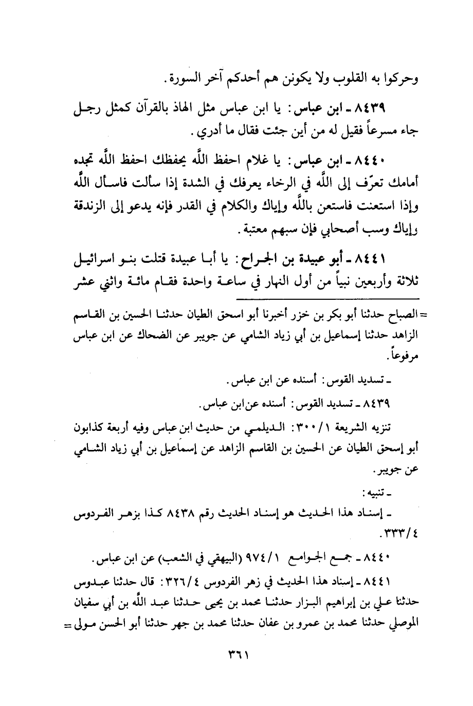 يَا غُلَام احفظ الله يحفظك احفظ الله تَجدهُ أمامك تعرف إِلَى الله فِي الرخَاء يعرفك فِي الشدَّة إِذا سَأَلت فاسأل الله وَإِذا استعنت فَاسْتَعِنْ بِاللَّه وَإِيَّاك وَالْكَلَام فِي الْقدر فَإِنَّهُ يَدْعُو إِلَى الزندقة وَإِيَّاك وَسَب أَصْحَابِي فَإِن سبهم معتبة