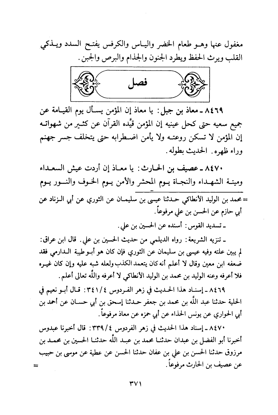 يَا معَاذ إِن الْمُؤمن يسْأَل يَوْم الْقِيَامَة عَن جَمِيع سَعْيه حَتَّى كحل عَيْنَيْهِ إِن الْمُؤمن قَيده الْقُرْآن عَن كثير من شهواته إِن الْمُؤمن لَا تسكن رَوْعَته وَلَا يَأْمَن اضطرابه حَتَّى يتَخَلَّف جسر جَهَنَّم وَرَاء ظَهره الحَدِيث بِطُولِهِ