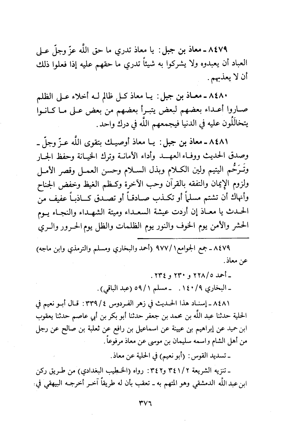 يَا معَاذ أوصيك بتقوى الله عز وَجل وَصدق الحَدِيث ووفاء الْعَهْد وَأَدَاء الْأَمَانَة وَترك الْخِيَانَة وَحفظ الْجَار وترحم الْيَتِيم ولين الْكَلَام وبذل السَّلَام وَحسن الْعَمَل وَقصر الأمل وَلُزُوم الْأَيْمَان والتفقه بِالْقُرْآنِ وَحب الْآخِرَة وكظم الغيظ وخفض الْجنَاح وأنهاك أَن تَشْتُم مُسلما أَو تكذب صَادِقا أَو تصدق كَاذِبًا عفيف من الْحَدث يَا معَاذ أَن أردْت عيشة السُّعَدَاء وميتة الشُّهَدَاء والنجاة يَوْم الْحَشْر والأمن يَوْم الْخَوْف والنور يَوْم الظُّلُمَات والظل يَوْم الحرور والري