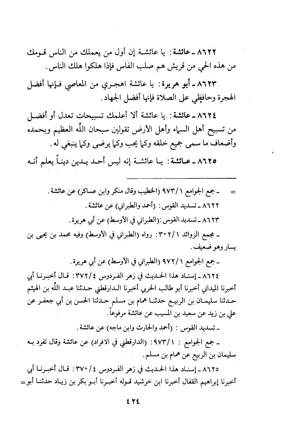 يَا عَائِشَة أَلا أعلمك تسبيحات تعدل أَو أفضل من تَسْبِيح أهل السَّمَاء وَأهل الأَرْض تَقُولِينَ سُبْحَانَ الله الْعَظِيم وَبِحَمْدِهِ وأضعاف مَا سمى جَمِيع خلقه وكما يحب وكما يرضى وكما يَنْبَغِي لَهُ