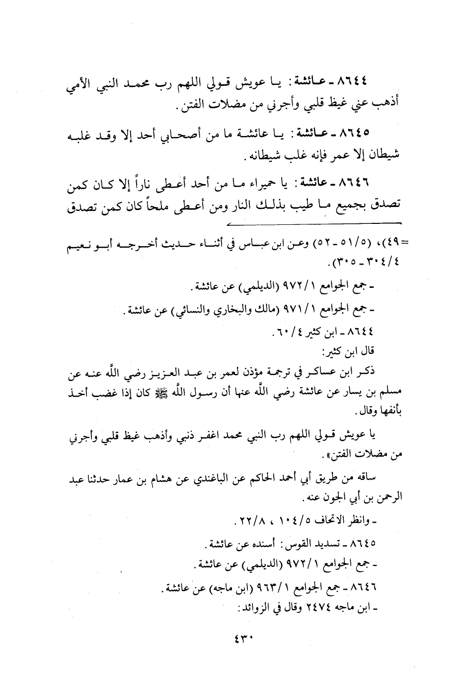 يَا عويش قولي اللَّهُمَّ رب مُحَمَّد النَّبِي الْأُمِّي أذهب عني غيظ قلبِي وأجرني من مضلات الْفِتَن