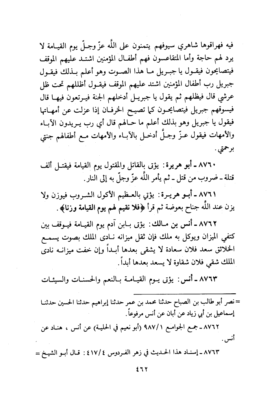 يُؤْتى بِابْن آدم يَوْم الْقِيَامَة فَيُوقف بَين كَتِفي الْمِيزَان ويوكل بِهِ ملك فَإِن ثقل مِيزَانه نَادَى الْملك بِصَوْت يسمع الْخَلَائق سعد فلَان سَعَادَة لَا يشقى بعْدهَا ابدا وَإِن خفت مِيزَانه نَادَى الْملك شقي فلَان شقاوة لَا يسْعد بعْدهَا أبدا