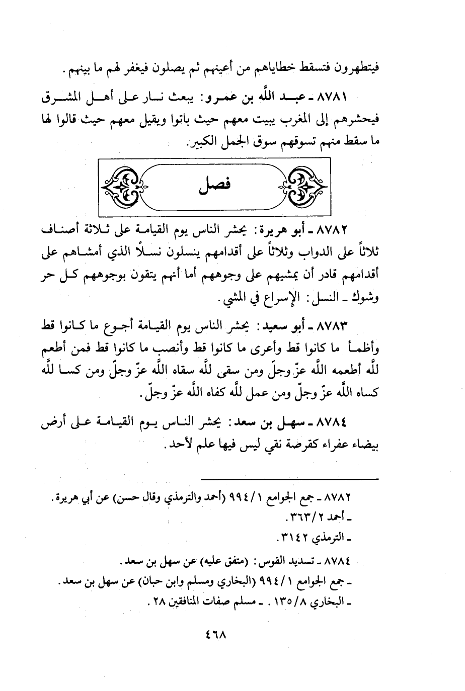 يحْشر النَّاس يَوْم الْقِيَامَة على ثَلَاثًا أَصْنَاف ثَلَاثَة على الدَّوَابّ وَثَلَاثًا على أَقْدَامهم يَنْسلونَ نَسْلًا الَّذِي أَمْشَاهُم على أَقْدَامهم قَادر أَن يُمشيهمْ على وُجُوههم أما أَنهم يَتَّقُونَ بِوُجُوهِهِمْ كل حر وَشَوْك النَّسْل الْإِسْرَاع فِي الْمَشْي