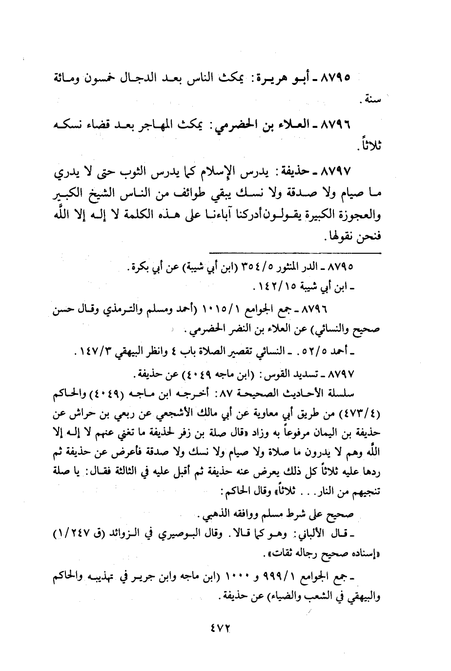 يدرس الْإِسْلَام كَمَا يدرس الثَّوْب حَتَّى لَا يدْرِي مَا صِيَام وَلَا صَدَقَة وَلَا نسك يبْقى طوائف من النَّاس الشَّيْخ الْكَبِير والعجوزة الْكَبِيرَة يَقُولُونَ أدركنا آبَاءَنَا على هَذِه الْكَلِمَة لَا إِلَه إِلَّا الله فَنحْن نقولها