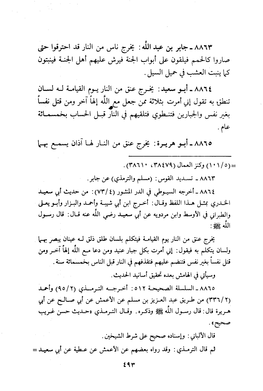 يخرج عنق من النَّار يَوْم الْقِيَامَة لَهُ لِسَان تنطق بِهِ تَقول إِنِّي أمرت بِثَلَاثَة مِمَّن جعل مَعَ الله إِلَهًا آخر وَمن قتل نفسا بِغَيْر نفس والجبارين فتنطوي فتلقيهم فِي النَّار قبل الْحساب بِخَمْسِمِائَة عَام