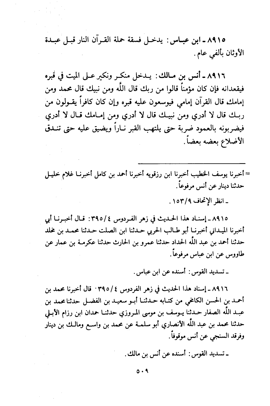 يدْخل مُنكر وَنَكِير على الْمَيِّت فِي قَبره فَيُقْعِدَانِهِ فَإِن كَانَ مُؤمنا قَالُوا من رَبك قَالَ الله وَمن نبيك قَالَ مُحَمَّد وَمن إمامك قَالَ الْقُرْآن إمامي فيوسعون عَلَيْهِ قَبره وَإِن كَانَ كَافِرًا يَقُولُونَ من رَبك قَالَ لَا أَدْرِي وَمن نبيك قَالَ لَا أَدْرِي وَمن إمامك قَالَ لَا أَدْرِي فَيَضْرِبُونَهُ بالعمود ضَرْبَة حَتَّى يلتهب الْقَبْر نَارا ويضيق عَلَيْهِ حَتَّى تندق الأضلاع بعضه بَعْضًا