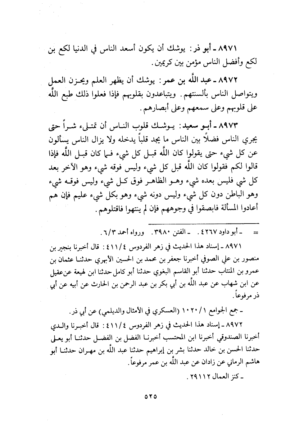 يُوشك قُلُوب النَّاس أَن تمتلئ شرا حَتَّى يجْرِي النَّاس فضلا بَين النَّاس مَا يجد قلبا يدْخلهُ وَلَا يزَال النَّاس يسْأَلُون عَن كل شَيْء حَتَّى يَقُولُوا كَانَ الله قبل كل شَيْء فَمَا كَانَ قبل الله فَإِذا قَالُوا لكم فَقولُوا كَانَ الله قبل كل شَيْء وَلَيْسَ فَوْقه شَيْء وَهُوَ الآخر بعد كل شَيْء فَلَيْسَ بعده شَيْء وَهُوَ الظَّاهِر فَوق كل شَيْء وَلَيْسَ فَوْقه شَيْء وَهُوَ الْبَاطِن دون كل شَيْء وَلَيْسَ دونه شَيْء وَهُوَ بِكُل شَيْء عليم فَإِن هم أعادوا الْمَسْأَلَة فابصقوا فِي وُجُوههم فَإِن لم ينْتَهوا فاقتلوهم