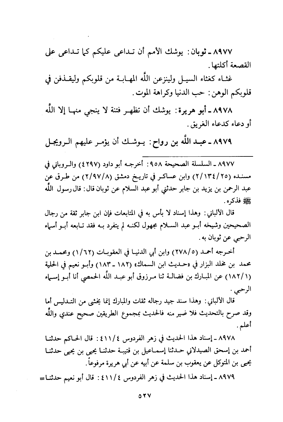 غثاء كغثاء السَّيْل وَلَينْزَعَنَّ الله المهابة من قُلُوبكُمْ وليقذفن فِي قُلُوبكُمْ الوهن حب الدُّنْيَا وَكَرَاهَة الْمَوْت