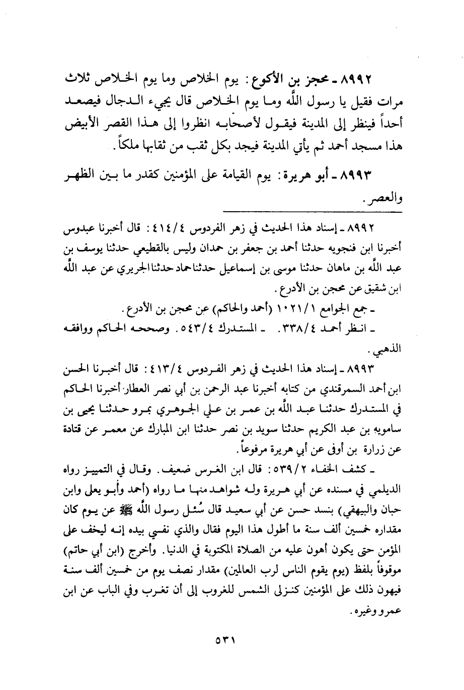 يَوْم الْخَلَاص وَمَا يَوْم الْخَلَاص ثَلَاث مَرَّات فَقيل يَا رَسُول الله وَمَا يَوْم الْخَلَاص قَالَ يَجِيء الدَّجَّال فيصعد أحدا فَينْظر إِلَى الْمَدِينَة فَيَقُول لأَصْحَابه انْظُرُوا إِلَى هَذَا الْقصر الْأَبْيَض هَذَا مَسْجِد أَحْمد ثمَّ يَأْتِي الْمَدِينَة فيجد بِكُل ثقب من ثقابها ملكا