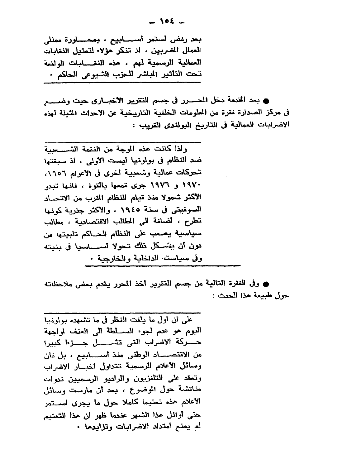 وإذا كانت هذه الموجة من النقمة الشعبية ضد النظام في بولونيا ليست الأولى؛ إذ سبقتها تحركات عمالية وشعبية أخرى في الأعوام 1956 و1970 و1976 جرى قمعها بالقوة، فإنها تبدو الأكثر شمولًا منذ قيام النظام المقرب من الاتحاد السوفيتي في سنة 1945، والأكثر جذرية كونها تطرح -إضافة إلى المطالب الاقتصادية- مطالب سياسية يصعب على النظام الحاكم تلبيتها من دون أن يشكل ذلك تحولًا أساسيًّا في بنيته وفي سياسته الداخلية والخارجية.
