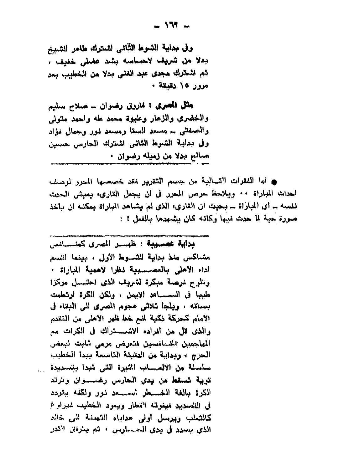 - أما الفقرات التالية من جسم التقرير، فقد خصصها المحرر لوصف أحداث المباراة ... ويلاحظ حرص المحرر في أن يجعل القارئ يعيش الحدث نفسه -أي: المباراة- بحيث إن القارئ الذي لم يشاهد المباراة يمكنه أن يأخذ صورة حية لما حدث فيها، وكأنه كان يشهدها بالفعل!: