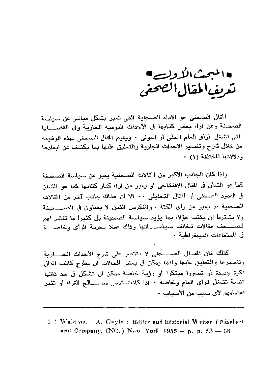 المقال الصحفي: هو الأداة الصحفية التي تعبر بشكل مباشر عن سياسة الصحيفة، وعن آراء بعض كُتَّابها في الأحداث اليومية الجارية، وفي القضايا التي تشغل الرأي العام المحلي أو الدولي. ويقوم المقال الصحفي بهذه الوظيفة من خلال شرح وتفسير الأحداث الجارية، والتعليق عليها بما يكشف عن أبعادها ودلالاتها المختلفة1.