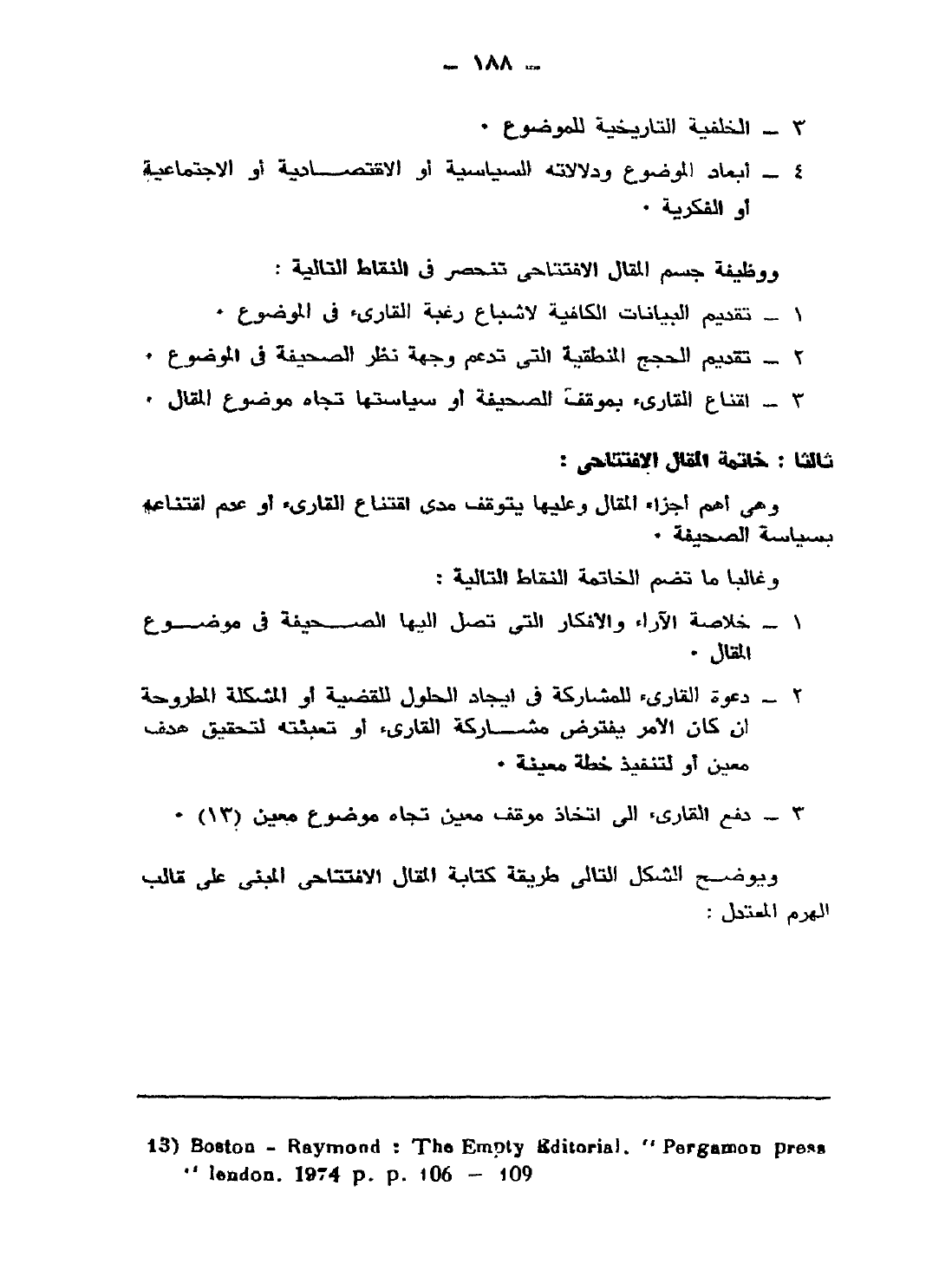 وهي أهم أجزاء المقال، وعليها يتوقف مدى اقتناع القارئ أو عدم اقتناعه بسياسة الصحيفة.
