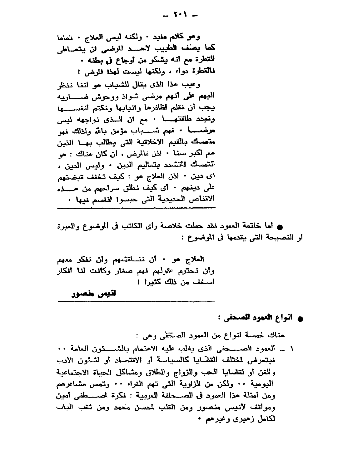 - أما خاتمة العمود، فقد حملت خلاصة رأي الكاتب في الموضوع، والعبرة أو النصيحة التي يقدمها في الموضوع:
