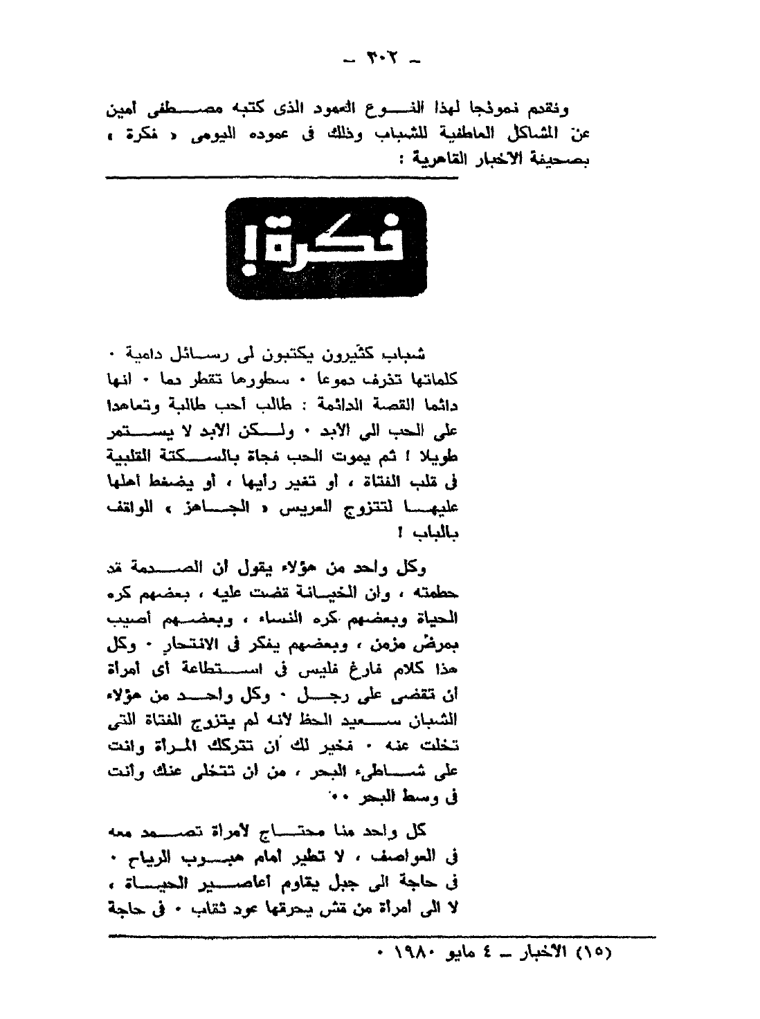 شباب كثيرون يكتبون لي رسائل دامية. كلماتها تذرف دموعًا. سطورها تقطر دمًا. إنها دائمًا القصة الدائمة: طالب أحب طالبة وتعاهدا على الحب إلى الأبد. ولكن الأبد لا يستمر طويلًا! ثم يموت الحب فجأة بالسكتة القلبية في قلب الفتاة، أو تغير رأيها، أو يضغط أهلها عليها لتتزوج العريس "الجاهز" الواقف بالباب!